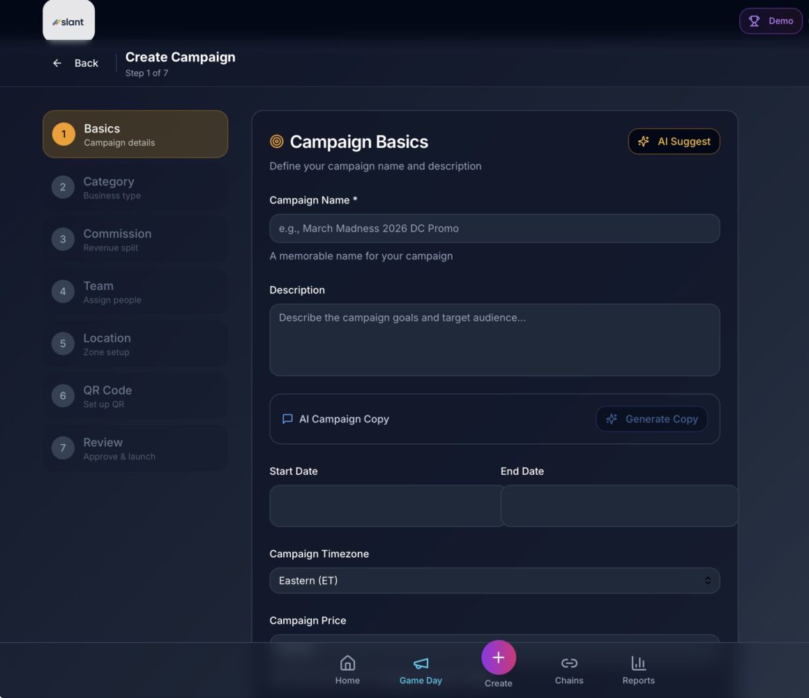Slant’s flow is built for real operators—game days, NIL activations, conferences, city tourism campaigns, and event weekends where turnout matters.
